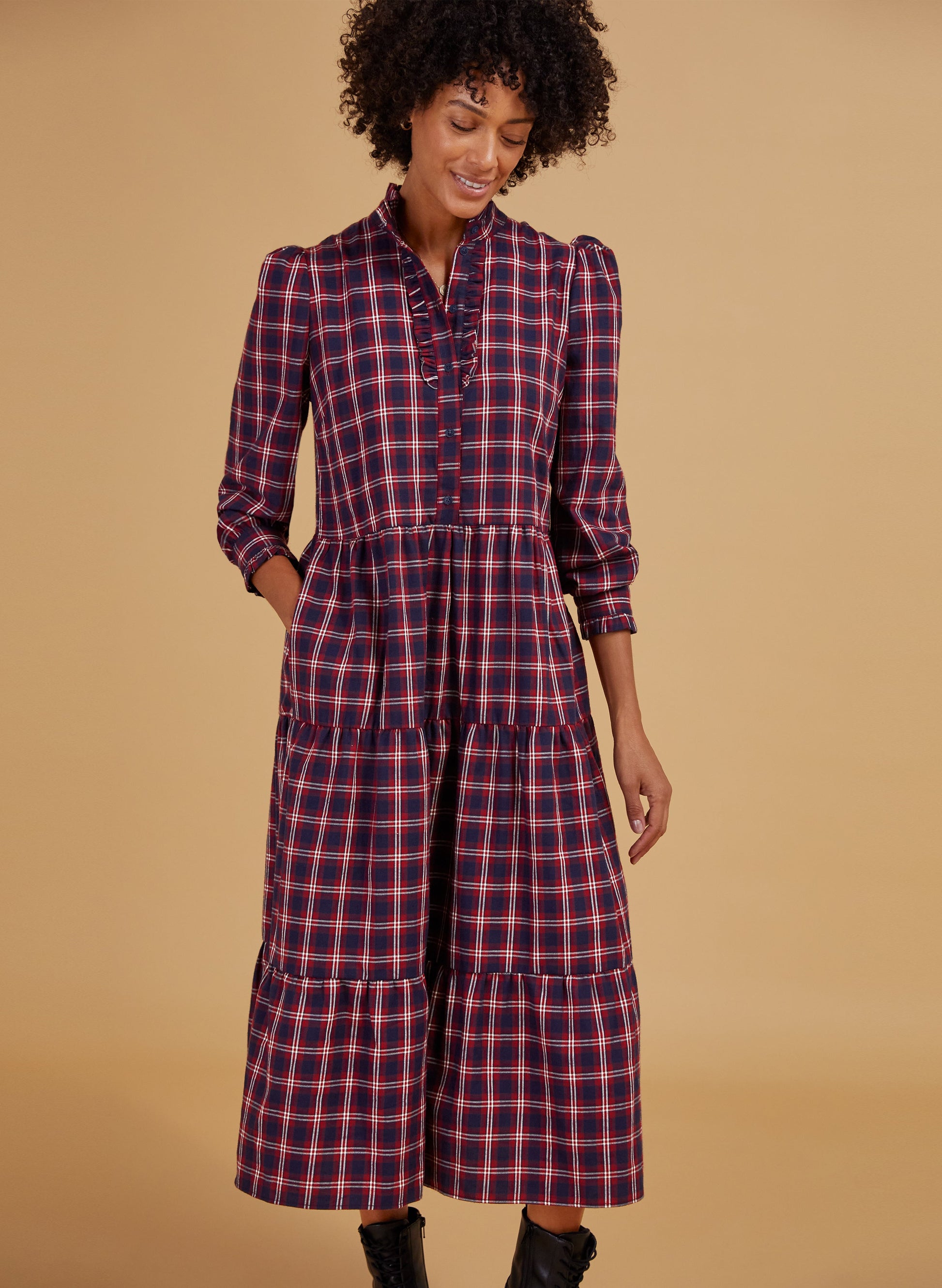 Fits true to size, we suggest ordering your normal size. A relaxed checked dress with sleeves makes weekend dressing simple - whatever the weather is doing. The Cara’s ruffled collar and frilly placket and cuffs lend a feminine twist to a masculine pattern, and is so easy to throw-on with trainers or boots. The top half buttons down to the waist and there’s lots of volume in the sleeves - when the temperature really dips, layer in a slim-fitting rollneck for maximum wear. Made from yarn-dyed organic cotton. Loose tiered skirt. Pockets in side seams. Relaxed fit.