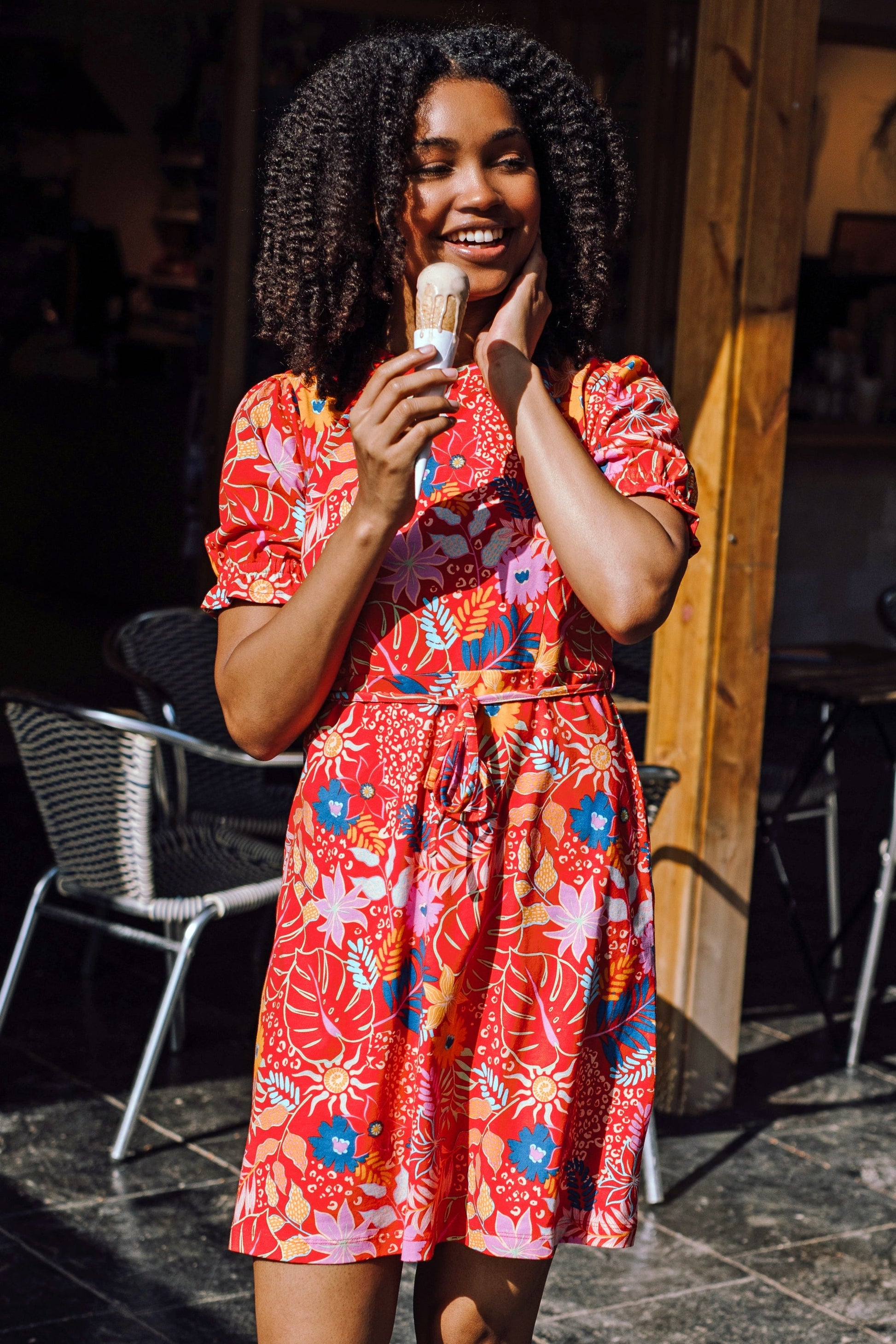 The NEW Cynthia dress is a fit and flare jersey dress with round neck and skinny belt. The short sleeve are cuffed with shirring to add a frill. Perfect for sunny days. Featuring our new Painted Jungle print of colourful tropical leaves and flowers on a vibrant red base.. Chloe is 5'9" and is wearing a size 10. 100% Cotton. Machine Washable (Delicate). Fit and flare shape. Round neck. Skinny waist belt. Short shirred sleeves. Neck to hem length for a size 12: 92cm. Bust underarm to underarm for a size 12: 49cm