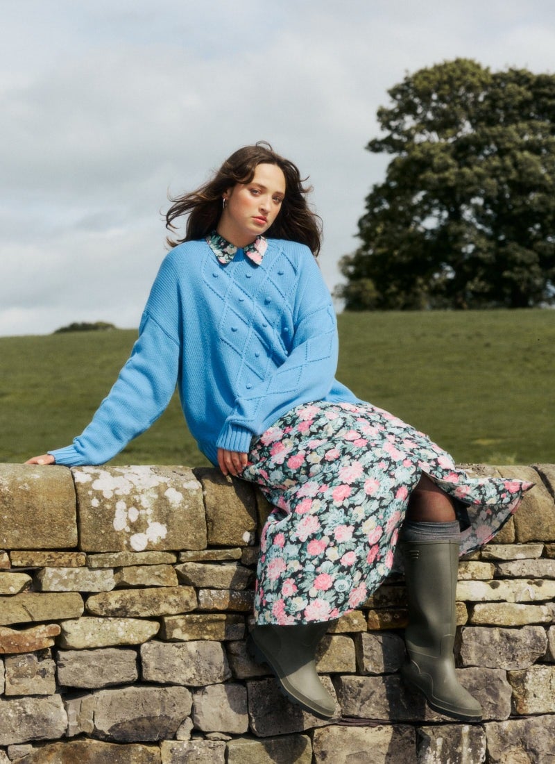 Pretty in pastels. The Dion Midi is made from a floral jacquard damask fabric in an all-over 1980s-inspired pastel floral print on a black background and features a retro shaped collar, a fitted bodice with a curved underbust seam and gathers to add shape, a functional button-down front with covered buttons, long, voluminous sleeves with deep cuffs, and a midi-length skirt. No matter where you're heading, this effortlessly elegant midi dress is bound to be your new occasion wear go-to!