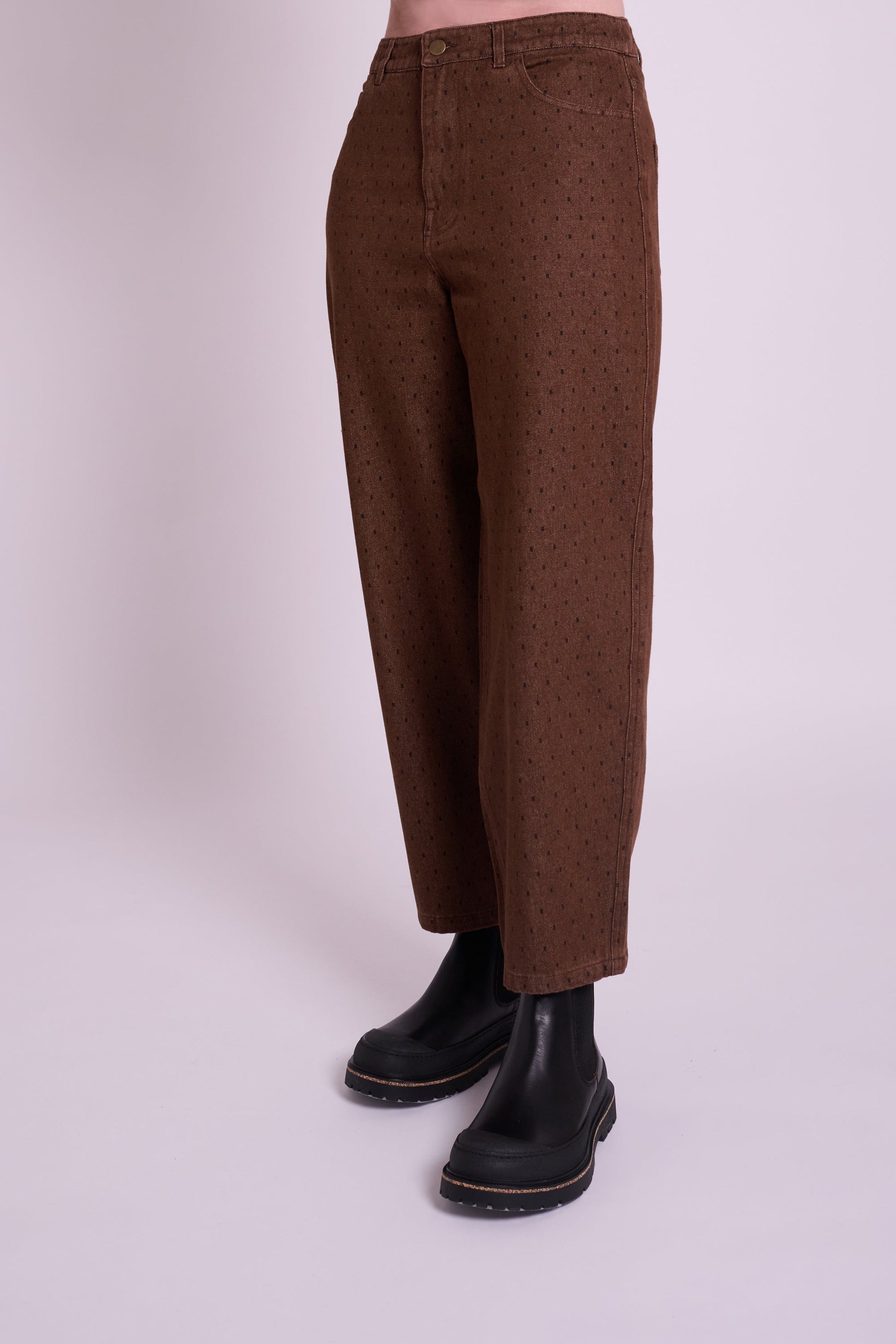 Step out in style with the Dolly Dot Dash Jean. These on-trend barrel-leg jeans, in season perfection brown denim jean, are peppered with a black washed dot dash print. Designed with a high rise for ultimate comfort and a clever dart at the back ankle to shape your silhouette, theyre as easy to wear as they are eye-catching.. High rise. 72% Cotton 11% Viscose. Machine washable, cool wash.. Emily is 5'9, size 10 hips wearing a 10.