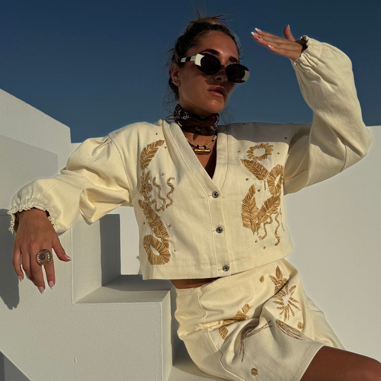 This cropped jacket feels so chic and clean, it's the perfect lightweight throw over for the days in the sunshine! The gorgeous floral and palm print, in a stunning textured raffia, paired with the structured stitching elevate the simple silhouette. We've also added branded metal buttons for a more jacket like construct. - Textured Raffia Embroidery - Elasticated Cuffs - Breast Feeding Friendly - Button Up Fastening Composition: Main: 98% Cotton, 2% Elastane, Lining: 100% Viscose Length: 45.5cm side neck point to hem Please Note - This length is based on our size M sample. Our products are graded, therefore smaller sizes will be shorter and larger sizes will be longer Base Colour: Cream Wash Care: Handwash Only S= 6/8, M = 10/12, L= 14/16, XL= 18/20