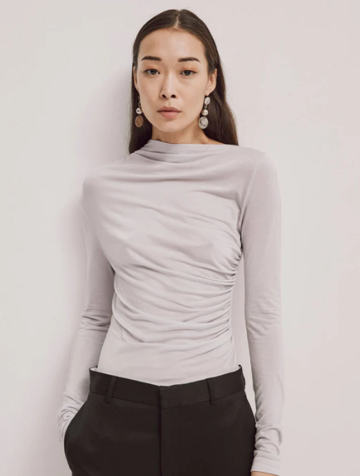 A fine, long sleeve top cut on the hips for a close fit with ruched detailing on the left side and right shoulder. Made from light and breathable MicroModal, the top is silky-soft and gently highlights the silhouette. Wear it with a pair of oversized denim or sleek trousers.