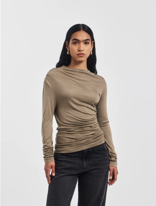 A fine, long sleeve top cut on the hips for a close fit with ruched detailing on the left side and right shoulder. Made from light and breathable MicroModal, the top is silky-soft and gently highlights the silhouette. Wear it with a pair of oversized denim or sleek trousers.