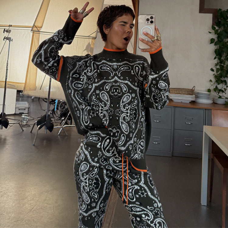Our OG bandana print, reimagined onto our best-selling knit co-ords! A soft knit base with contrast orange stitching along the seams and cuffs for an extra touch of interest. Pair with the matching joggers or a wide leg jean for an effortless everyday wear. - Roll Neck Composition: 53% LENZING™ ECOVERO™ Viscose, 27% Polyester, 20% Polyamide LENZING™ ECOVERO™ are trademarks of Lenzing AG Length: 62cm side neck point to hem Please Note - This length is based on our size 10 sample. Our products are graded, therefore smaller sizes will be shorter and larger sizes will be longer Base Colour: Khaki Green Wash Care: 30 Degree Wash XS= 4/6, S= 6/8, M = 10/12, L= 14/16, XL= 18/20, XXL = 22/24, XXXL = 26/28 We're more about the planet than we are perfection, so can't guarantee the exact print placement shown here. This is down to how we cut the fabric to limit wastage.