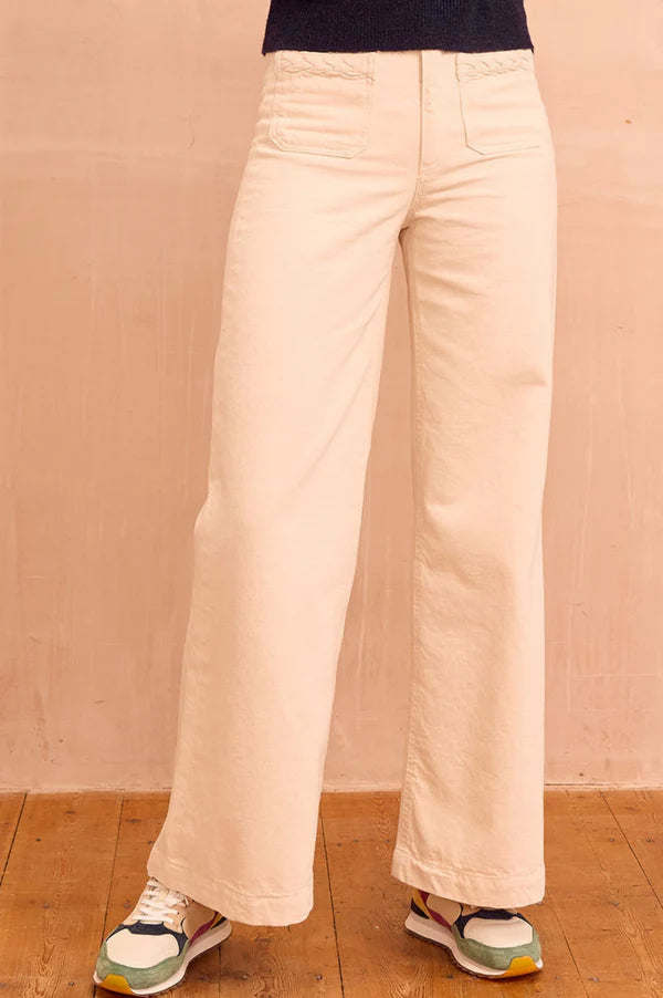 The Maison Hotel Maxton Hamlet Jean in Ecru features a clean wide leg cut. High-waisted, fitted at the top, falling wide ankle grazer length. Patch pockets featuring a subtle braiding detail.