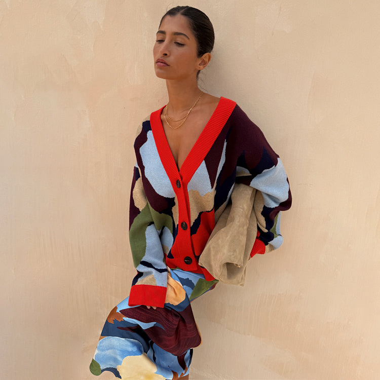 A bright and bold recoloured version of our iconic artist print, this soft touch cardigan is the perfect pop of colour to add to any outfit! With red trim detailing along the neckline, cuffs and pockets adding an extra element of texture to the simple silhouette. Wear with the matching dorris skirt for an effortless co-ord or over a tank and jeans. - Button Up - Breast Feeding Friendly - Good For Bump Dressing Composition: 53% LENZING™ ECOVERO™ Viscose, 27% Polyester, 20% Polyamide LENZING™ ECOVERO™ are trademarks of Lenzing AG Please note that pilling is a natural characteristic of knitted fabrics and may occur over time, especially in areas subject to friction such as underarms, sides, and sleeves. Pilling is an natural result of many soft yarns and does not affect the durability or functionality of the garment. To control, avoid excessive friction from bags and rough surfaces, and use a fabric comb or de-pilling device to gently remove pills as needed. Length: 61cm side neck point to hem Please Note - This length is based on our size M sample. Our products are graded, therefore smaller sizes will be shorter and larger sizes will be longer Base Colour: Multi Wash Care: 30 Degree Wash S= 6/8, M = 10/12, L= 14/16, XL= 18/20, XXL = 22/24, XXXL = 26/28 We're more about the planet than we are perfection, so can't guarantee the exact print placement shown here. This is down to how we cut the fabric to limit wastage.