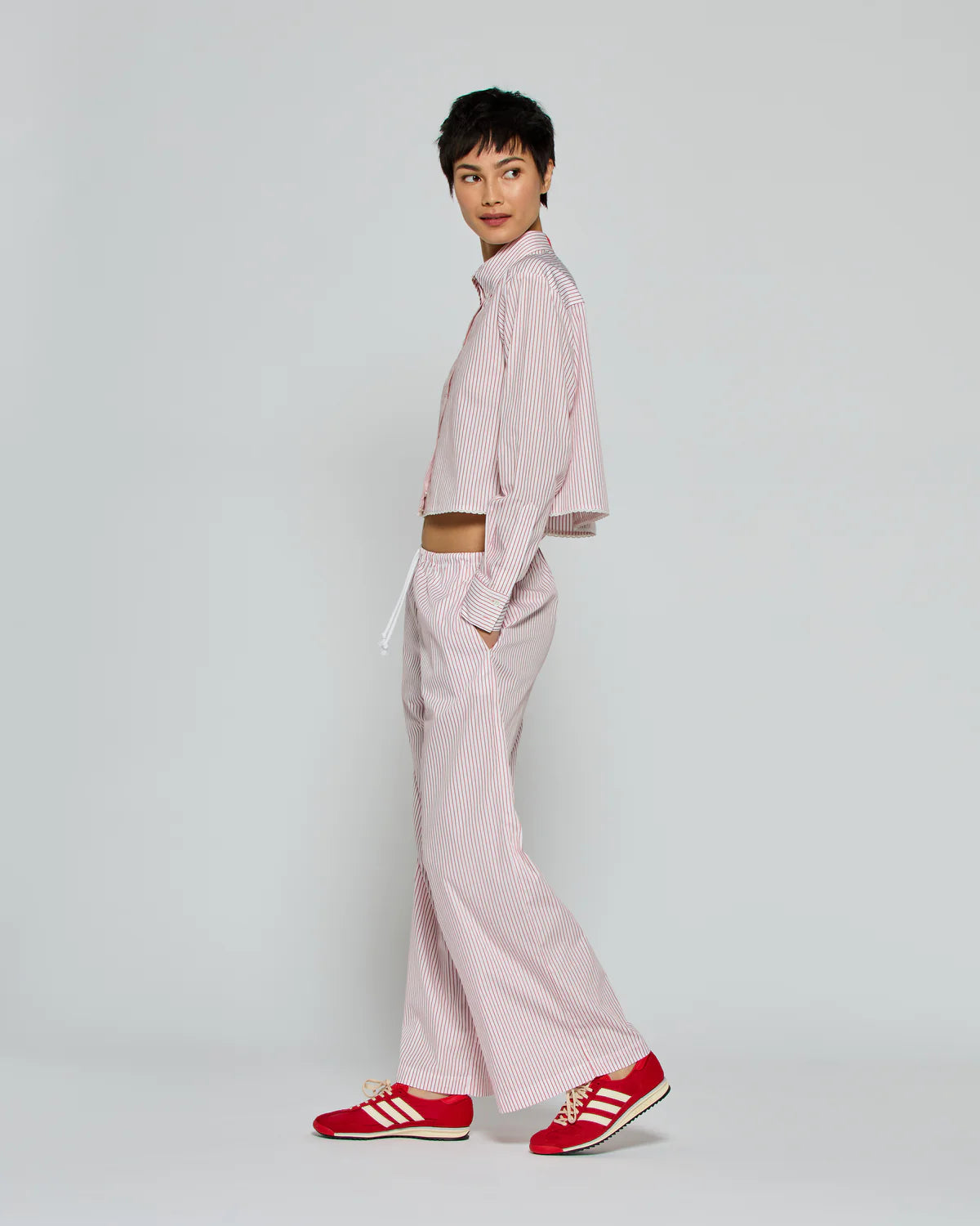 Our Striped Cropped Jogger is a must-have for warmer days. They have a narrow elastic waistband and drawstring tie, falling into a relaxed wide leg silhouette. Crafted in a striped cotton, the fabric offers a breezy, summery feel.