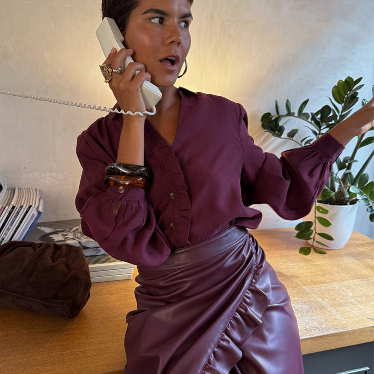 Our classic miley shirt with a twist! With blouson sleeves, a floaty silhouette and ruffle detailing along the button stand for an added touch of texture. We have added contrast tortoise buttons for an extra touch of interest and gorgeous embroidered logo on the back neck. - Button up - Embroidered logo on back neck - Multi wear - Breastfeeding friendly *This product has an oversized fit, so if you are in between sizes, we recommend sizing down* Composition: 84% Lyocell 16% Polyester Length: 75cm Please Note - This length is based on our size 10 sample. Our products are graded, therefore smaller sizes will be shorter and larger sizes will be longer Base Colour: Wine Wash Care: 30 degree wash